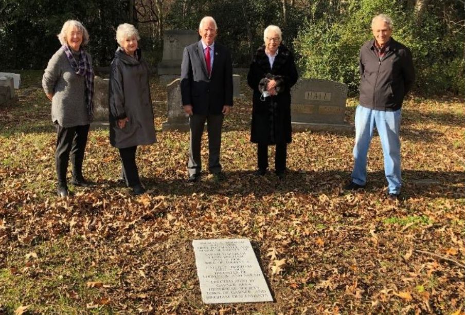 Attending the ceremony dedicating the monument were Garner Mayor Ken Marshburn, Garner Area Historical Society Executive Committee members Judy Bass, Karen Padgett and Kaye Whaley, JCHC Director Todd Johnson, and Bingham family descendants from the Smithfield area, including Wingate Lassiter, retired editor of the Smithfield Herald newspaper. The stone monument reads: “Thomas A. Bingham, 1847-1908, First Postmaster and Mayor of Garner, NC; Sarah Elizabeth Ligon Bingham, 1853-1906, Wife of Thomas A.; Callie E. Bingham, 1880-1905, Daughter of Thomas A. and Sarah. Erected 2020 by Garner Area Historical Society, Town of Garner, and Bingham Descendants.”