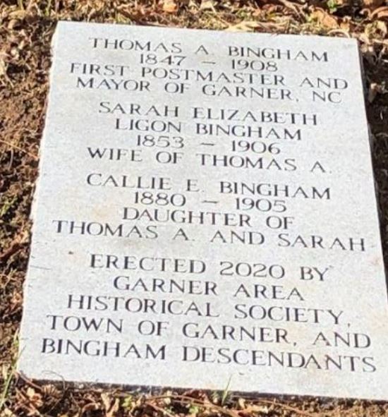 Todd Johnson, Director of the Johnston County Heritage Center, along with Garner historian Kaye Buffaloe Whaley, has done extensive research on Thomas Bingham. Bingham was involved in several different businesses throughout his life. After leaving Garner in the late1880’s, he returned to Johnston County. The location of the Binghams’ graves was known, but was never marked with headstones or monuments. Thomas Bingham was featured as a character (portrayed by Broadway actor John Arthur Greene) in the Johnston County Heritage Center’s annual Ghost Walk, which was recorded and broadcast on JCHC’s YouTube Channel in October of 2020; the production can still be seen at JohnstonNC Heritage.